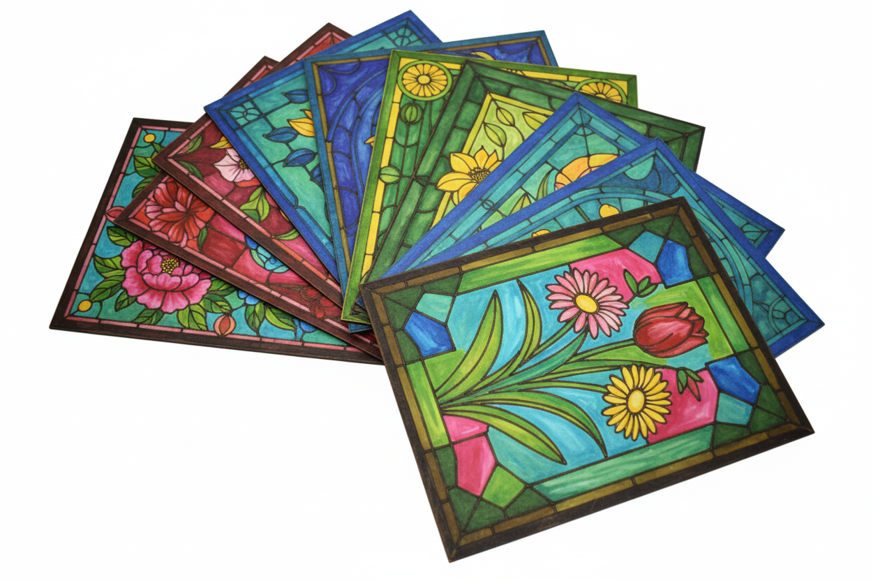Kolorowania farbami do szkła, akrylowymi lub innymi mediami, aby stworzyć efekt prawdziwego witraża.