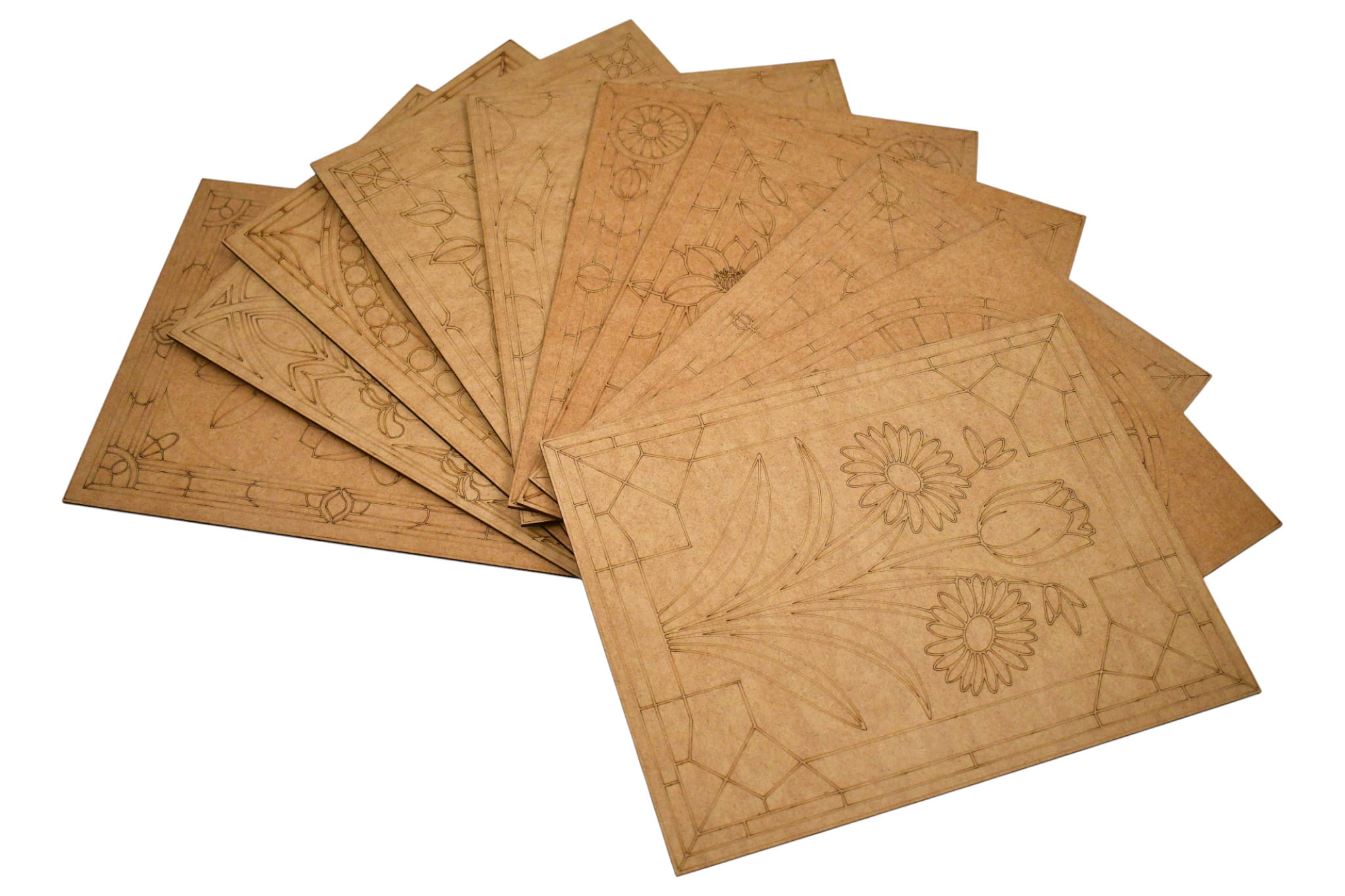Zestaw 10 sztuk podkładów pod witraże wykonanych z płyty MDF, gotowych do kreatywnego malowania i dekorowania. Każdy element ma wymiary 23x30 cm i posiada precyzyjnie wygrawerowany wzór, który naśladuje podział szkła w tradycyjnym witrażu. Są idealne do: