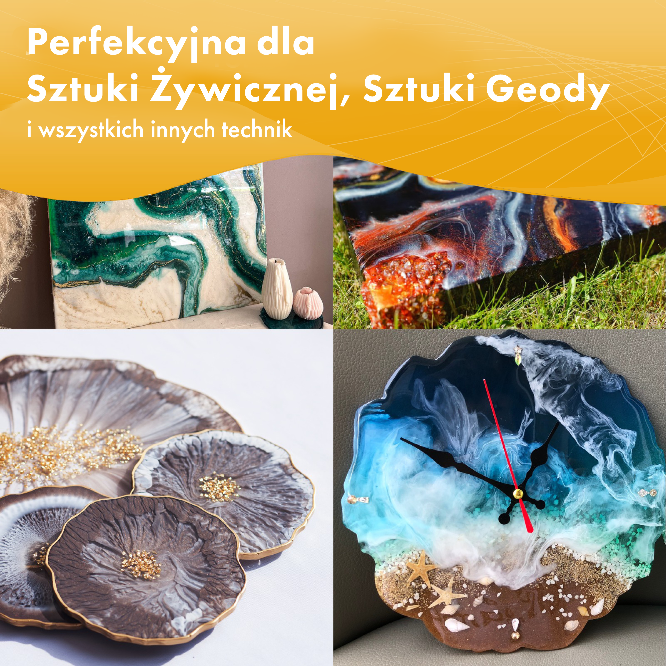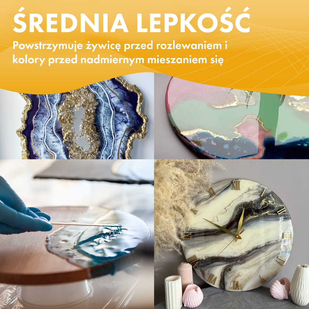 Idealna do Resin Art i Powłok: Wysoka lepkość sprawia, że pigmenty i barwniki pięknie trzymają się powierzchni, co jest kluczowe w pejzażach morskich, sztuce geody i tworzeniu efektów komórek i koron (przy użyciu kropli morskiej fali).