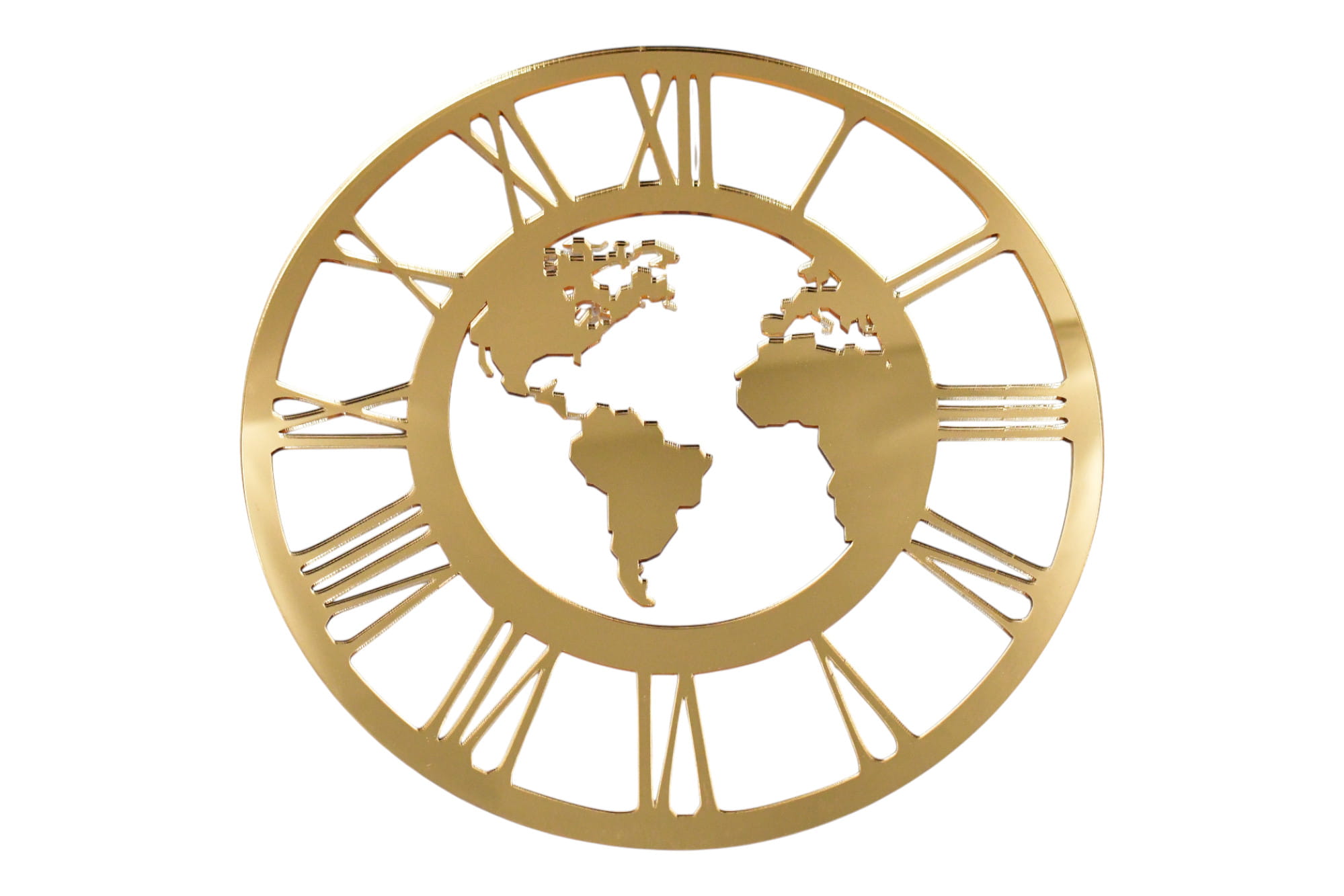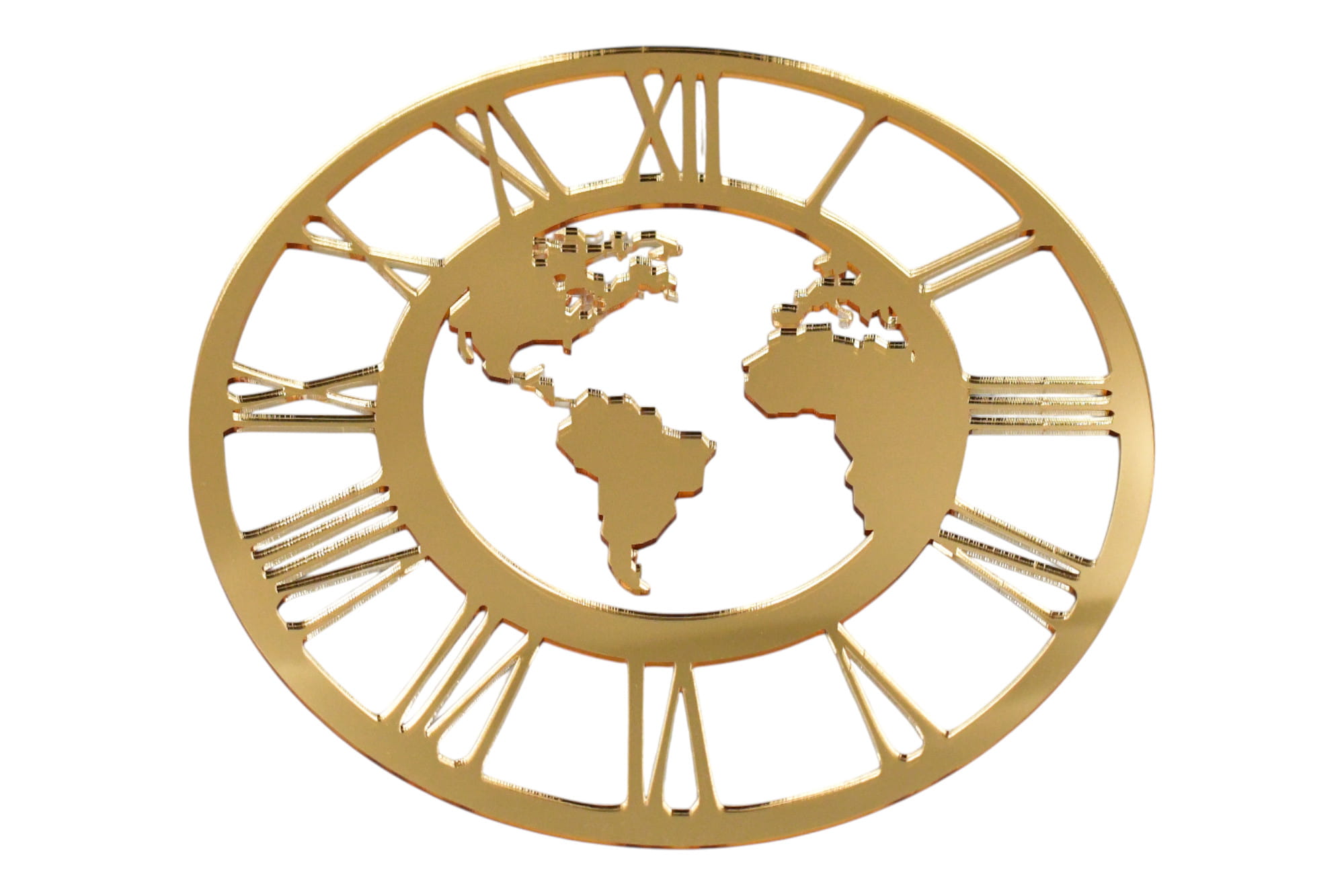 Dodaj swojemu wnętrzu wyjątkowego charakteru dzięki eleganckiej tarczy zegara wykonanej ze złotej, lustrzanej pleksi o grubości 3 mm. W centralnej części cyferblatu znajduje się precyzyjnie wycięta mapa świata, która podkreśli zamiłowanie do podróży i oryginalnych dekoracji. Całość uzupełniają subtelne cyfry rzymskie i delikatna, ażurowa obręcz, nadająca lekkości i nowoczesnego stylu.