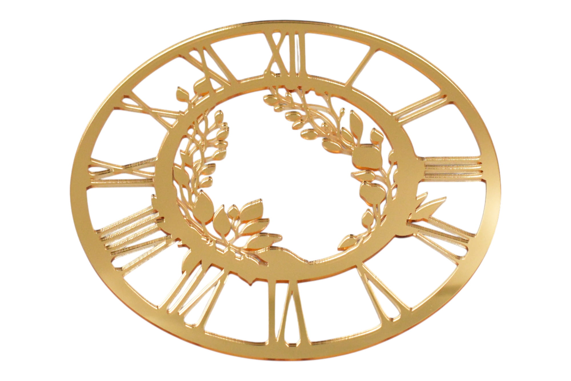 Tarcza zegara ze złotej pleksi lustrzanej z cyframi rzymskimi i motywem liści - cyferblat