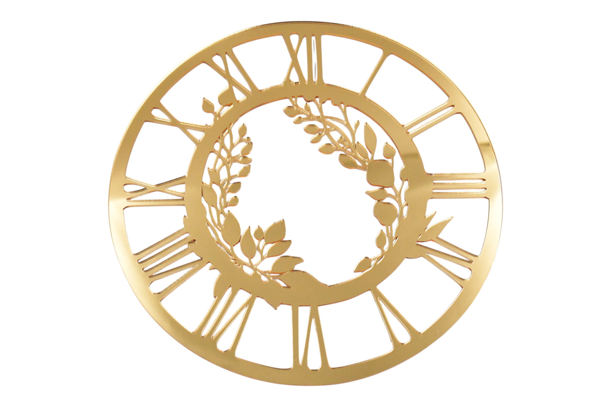 Wyjątkowa tarcza zegara wykonana z lustrzanej złotej pleksi o grubości 3 mm. Centralny motyw delikatnych liści dodaje lekkości i elegancji, sprawiając, że zegar staje się nie tylko funkcjonalnym elementem, ale i ozdobą wnętrza. Klasyczne cyfry rzymskie w ażurowej oprawie idealnie komponują się z roślinnym wzorem, tworząc harmonijną całość.