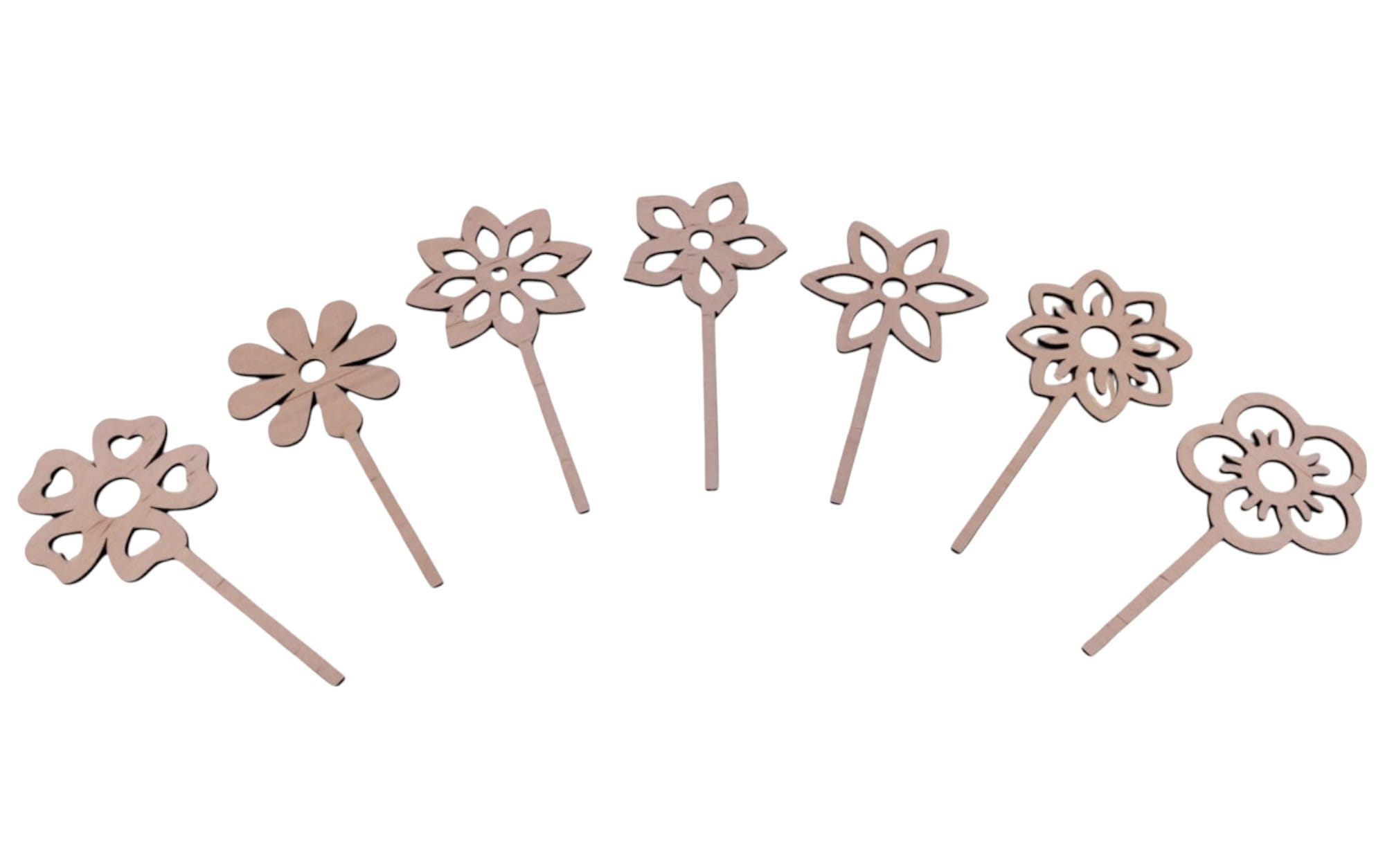 Wzbogać swoje dekoracje o wyjątkowy zestaw 7 topperów w kształcie kwiatków! Wykonane z wysokiej jakości sklejki o grubości 3 mm, są trwałe i lekkie, a ich wysokość wynosi 14 cm, dzięki czemu doskonale nadają się do większych aranżacji – takich jak dekoracje tortów, doniczek, bukietów czy stroików.